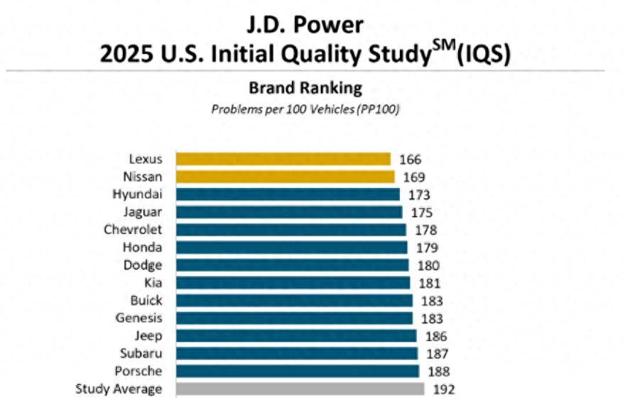 日产这次排到第二,169的PP100,确实让人意外。2025年日产在美国卖了87.3万辆,同比微增0.9%。Rogue奇骏和Altima天籁依然是销量担当。不过CVT变速箱问题通常是过保后才爆发,不知老用户有没被困扰到呢。