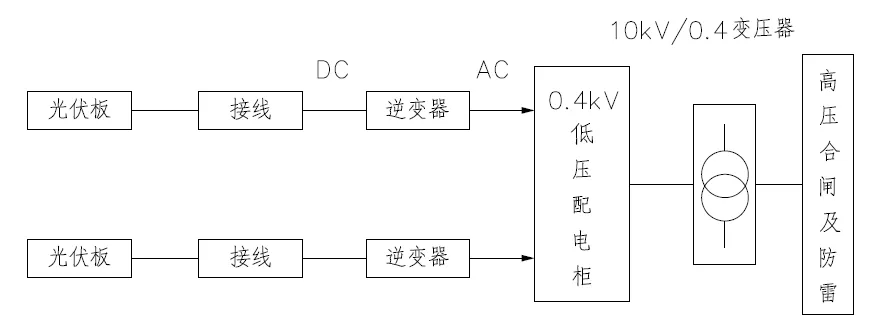 本项目每个光伏车棚采用光伏组件竖向排列7排203块光伏组件组成一个光伏阵列,4个车棚共计812块光伏组件。光伏阵列输出的直流电能,经逆变器转换为交流电能后,再经汇流线路和并网柜,分别就近接入区政府党政综合楼A区和B区配电室0.4kV供电系统低压母线端。