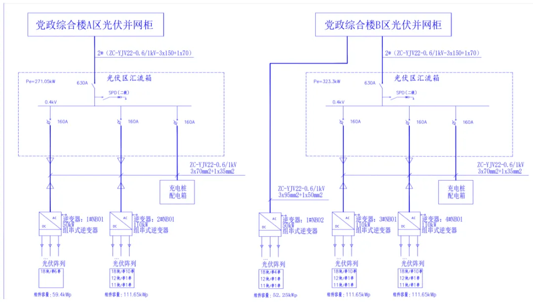 本项目有四个车棚棚顶,同时根据区政府党政综合楼A区和B区的用电差异,A区的日常用电负荷较低,不能够完全消纳西1和西2两个车棚的光伏发电量,考虑尽可能匹配自发自用容量,因此需要将西1号车棚的一部分约52.25kWp装机量通过电缆接入到B区配电室消纳。